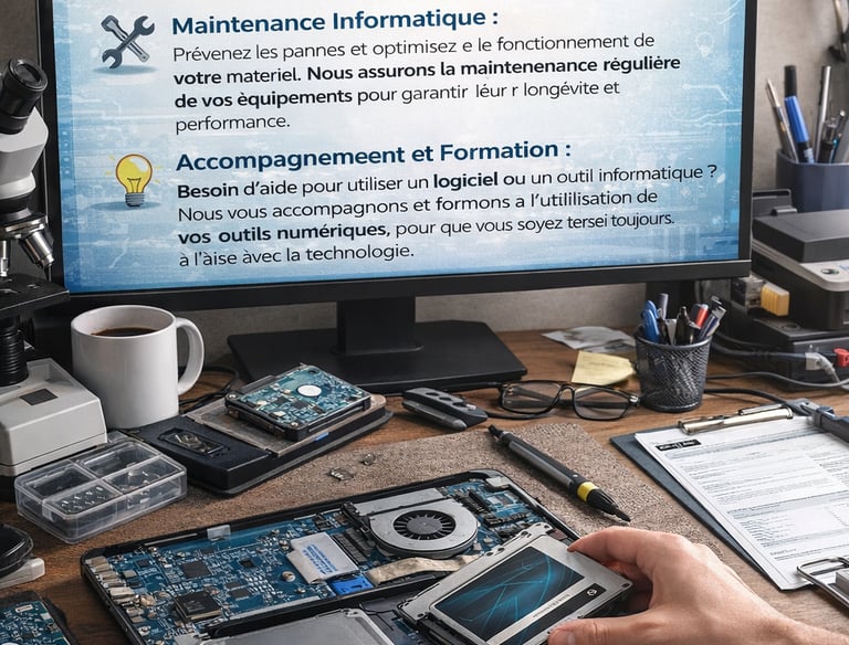 Nous proposons un accompagnement simple, humain et accessible pour tous vos besoins informatiques. Dépannage, installation, sécurité, maintenance et formation vous permettent de gagner en sérénité, optimiser vos outils et devenir plus autonome dans l'utilisation du numérique.
